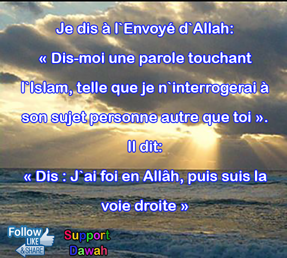 Je dis à l`Envoyé de Dieu: « Dis-moi une parole touchant l`Islam, telle que je n`interrogerai à son sujet personne autre que toi ». Il dit: