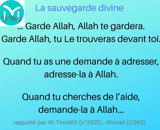 « O jeune homme, je vais t`enseigner quelques préceptes. Observe les commandements de Allah, il te protègera. Observe les commandements de Allah, tu le trouveras devant toi. Lorsque tu as à demander quelque chose, demande à Allah. Lorsque tu as à implorer assistance, implore assistance auprès d'Allah. Sache que si la communauté est d'accord, à l'unanimité, pour te faire quelque bien, cela ne te profitera que dans la mesure où Allah te l'aurait assigné, et si elle est d`accord à l'unanimité pour te causer quelque tort, tu n'en pâtiras en rien, sinon dans la mesure où Allah en aurait ainsi décidé à ton encontre. Certes, les calames sont levés et l'encre des feuillets a séché ».