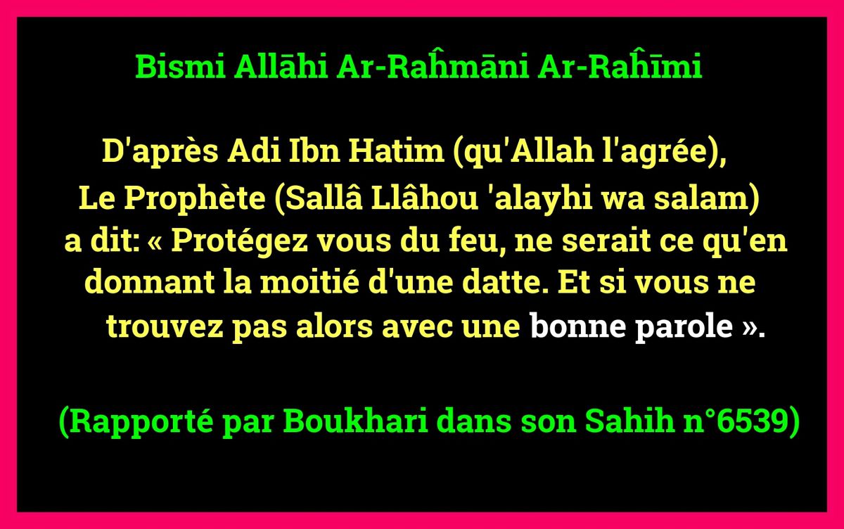 Aussi, que chacun de vous se protège contre le feu, ne serait-ce qu’en donnant la moitié d’une datte, et s’il n’en trouve pas, qu’il offre des paroles agréables. [Al-Boukhari]