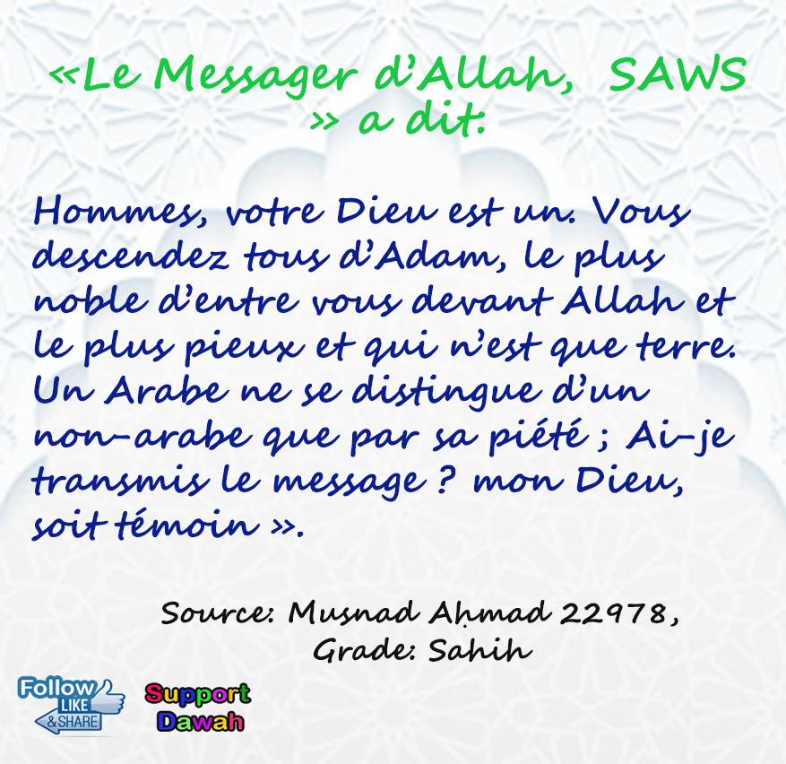 Hommes, votre Dieu est un. Vous descendez tous d’Adam, le plus noble d’entre vous devant Allah et le plus pieux et qui n’est que terre. Un Arabe ne se distingue d’un non-arabe que par sa piété ; Ai-je transmis le message ? mon Dieu, soit témoin ».