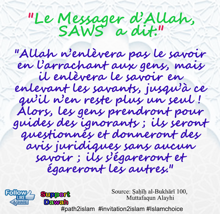 "Allah n’enlèvera pas le savoir en l’arrachant aux gens, mais il enlèvera le savoir en enlevant les savants, jusqu’à ce qu’il n’en reste plus un seul ! Alors, les gens prendront pour guides des ignorants ; ils seront questionnés et donneront des avis juridiques sans aucun savoir ; ils s’égareront et égareront les autres."