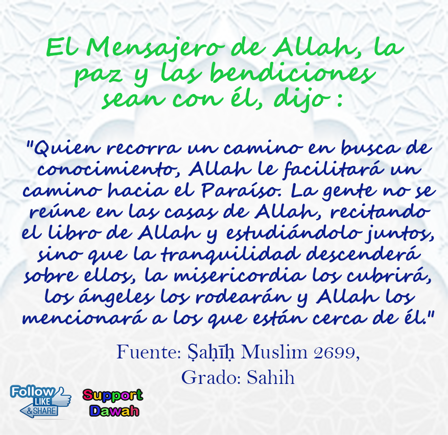 Quien recorra un camino en busca de conocimiento, Allah le facilitará un camino hacia el Paraíso. La gente no se reúne en las casas de Allah, recitando el libro de Allah y estudiándolo juntos, sino que la tranquilidad descenderá sobre ellos, la misericordia los cubrirá, los ángeles los rodearán y Allah los mencionará a los que están cerca de él.